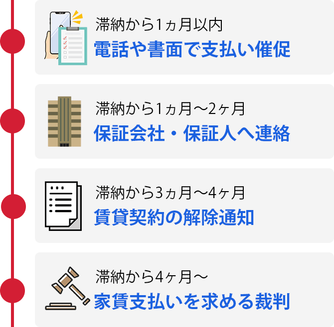 上で述べたように、1ヶ月程度でいきなり強制退去とはならず、以下のような流れに沿って退去に至ります。